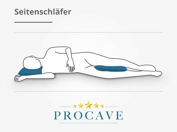 Die seitliche Schlafhaltung entlastet bei Verwendung des passenden Kissens die Wirbelsäule. Dabei sinken die Schultern und der Hüft- und Beckenbereich sanft in die Matratze ein und ermöglichen der Wirbelsäule eine gerade Ausrichtung. Damit Ihr Körper sanft in die Matratze einsinken kann, empfiehlt sich tendenziell eine etwas weichere Matratze, also ein niedrigerer Härtegrad. Wer auf der Seite schläft und rund 80 kg wiegt, ist mit einer H2 Matratze meist besser beraten als mit einer H3. Beim Schlafen in Seitenposition benötigt der Körper weniger Körperstützung als beim Schlafen in anderen Positionen.