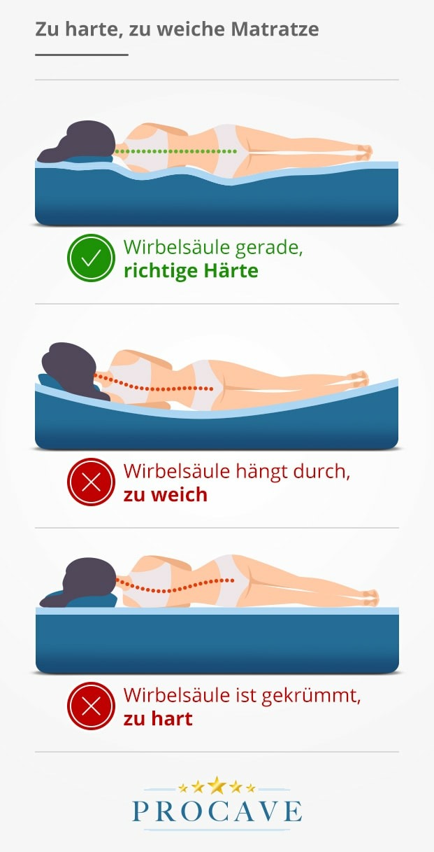 Die richtige Matratze macht den Unterschied. Nur wenn der Härtegrad zu Ihrem Körper passt, bleibt Ihre Wirbelsäule in einer natürlichen, geraden Position. Eine krumme Lage der Wirbelsäule kann zu Rückenschmerzen, Durchblutungsstörungen und Verspannungen führen. Ist die Matratze zu weich, sinkt der Hüftbereich zu tief ein und die Wirbelsäule hängt durch. Ist die Matratze zu hart, krümmt sich die Wirbelsäule, da sich die Matratze nicht an Becken und Schulterbereich anschmiegt. Mit einer passenden Matratze können sich Bandscheiben, Muskeln und Rücken über Nacht regenerieren und Verspannungen sowie Rückenschmerzen vorgebeugt werden.