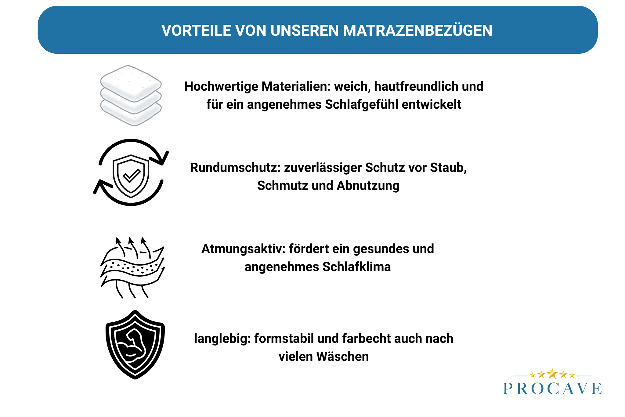 Ein Matratzenbezug schützt die Matratze vor Schmutz, Abnutzung und Feuchtigkeit. Er verbessert die Hygiene im Bett, verlängert die Lebensdauer der Matratze und kann einfach gereinigt werden. Das sorgt für ein frisches und angenehmes Schlafklima.