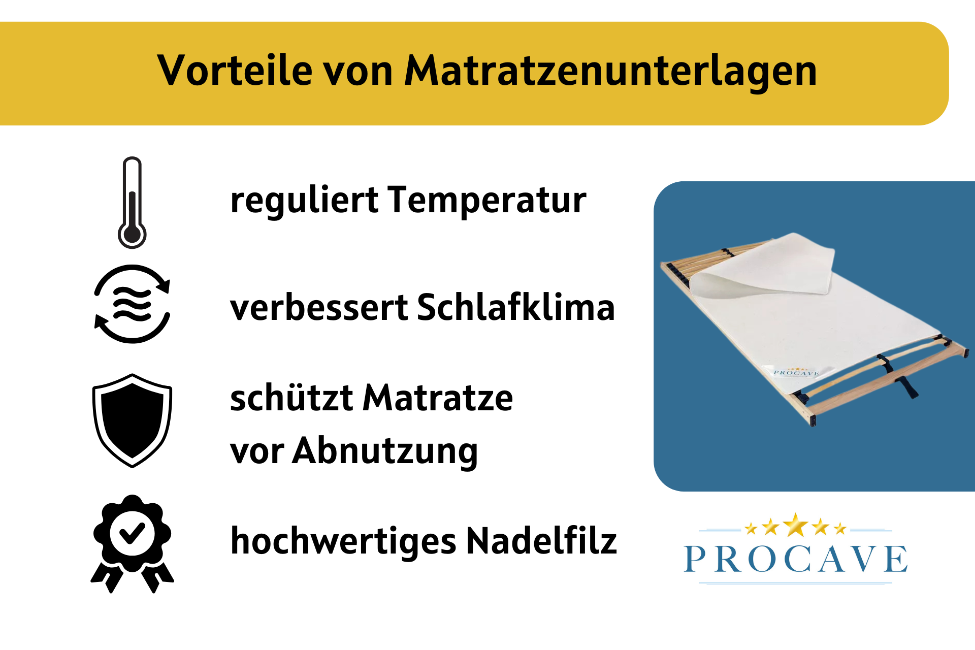 PROCAVE bietet in dieser Kategorie zwei praxiserprobte Lösungen: den Filzschoner und den Noppenschoner. Beide Varianten sind Matratzenunterlagen, die zwischen Matratze und Lattenrost eingesetzt werden und die Unterseite zuverlässig schützen.